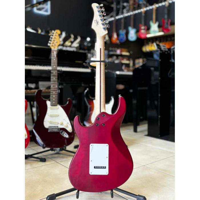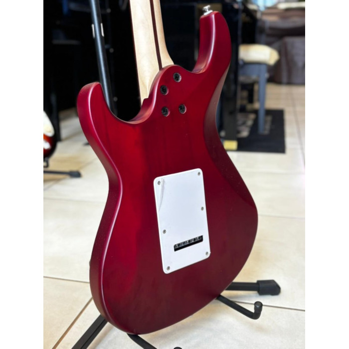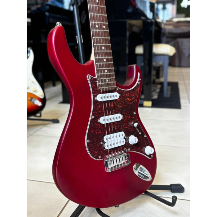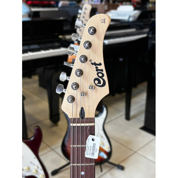 Guitarra Cort G110 OPBC, com captadores na configuração HSS, escala em Jatoba, e braço em Maple com acabamento fosco. Na cor Open Pore Black Cherry (OPBC).