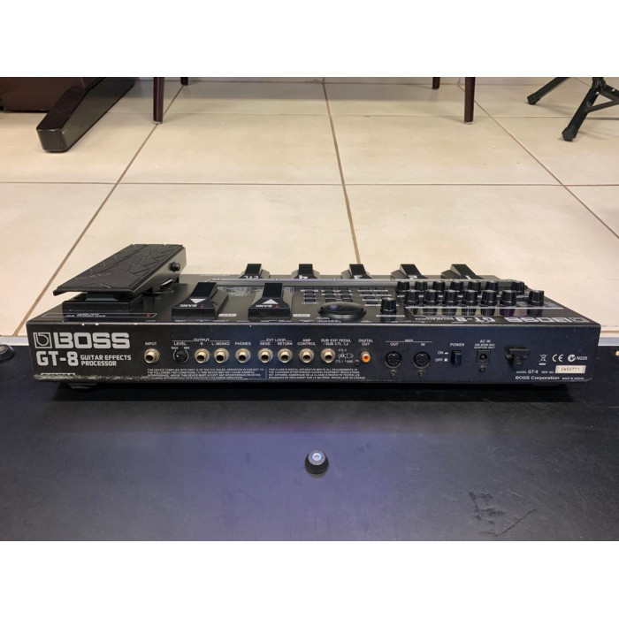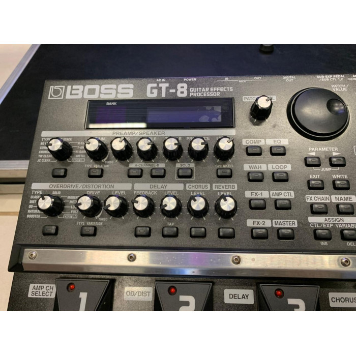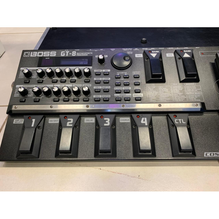 A Boss GT-8 é uma pedaleira multi-efeitos clássica da Boss, reconhecida por sua construção robusta e pelo motor de modelagem duplo COSM, que permite usar dois simuladores de amplificador simultaneamente.