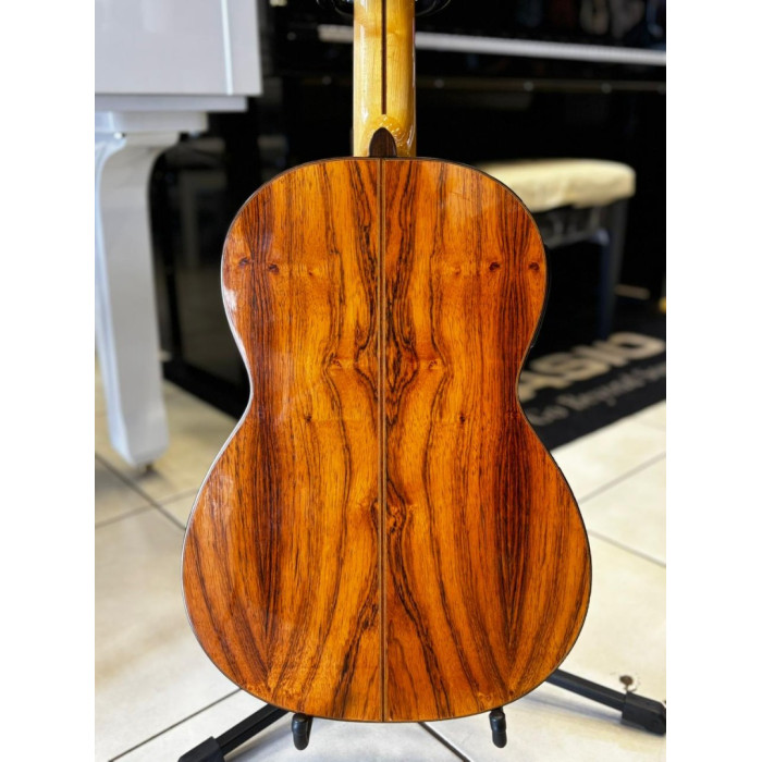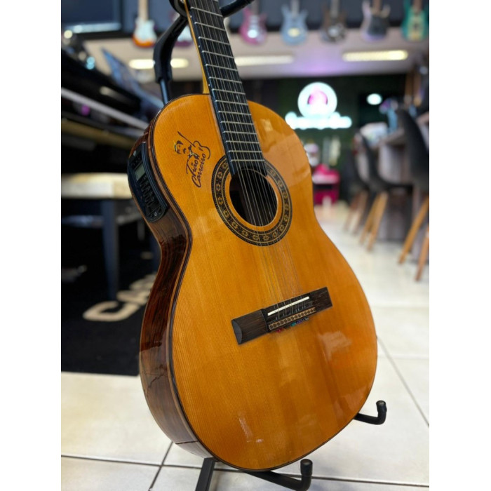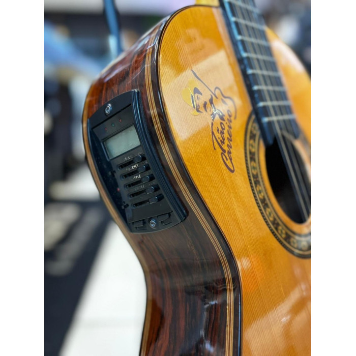 Construção: Corpo no formato Clássico (maior e mais fundo), com tampo em Spruce maciço (abeto) e laterais/fundo em Jacarandá (laminado ou maciço, dependendo do modelo).