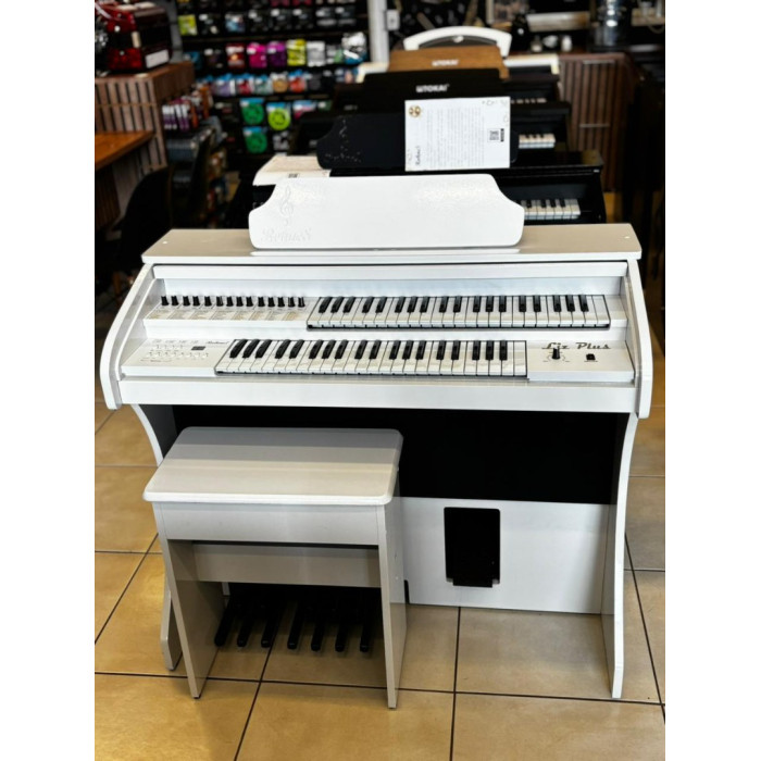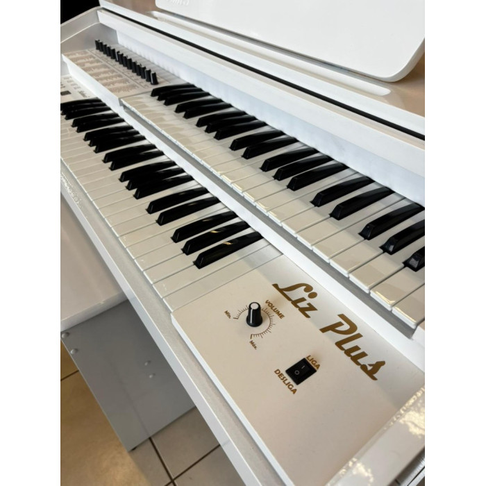 O modelo Liz Plus conta com 127 timbres no teclado superior, inferior e pedaleira, 16 tipos de Ritmo, AutoBass, e efeitos especiais como Sustain Upper, Vibratto, Reverb/Chorus e Balance (Upper-Lower).