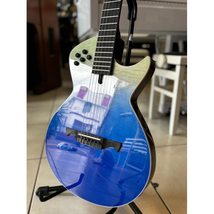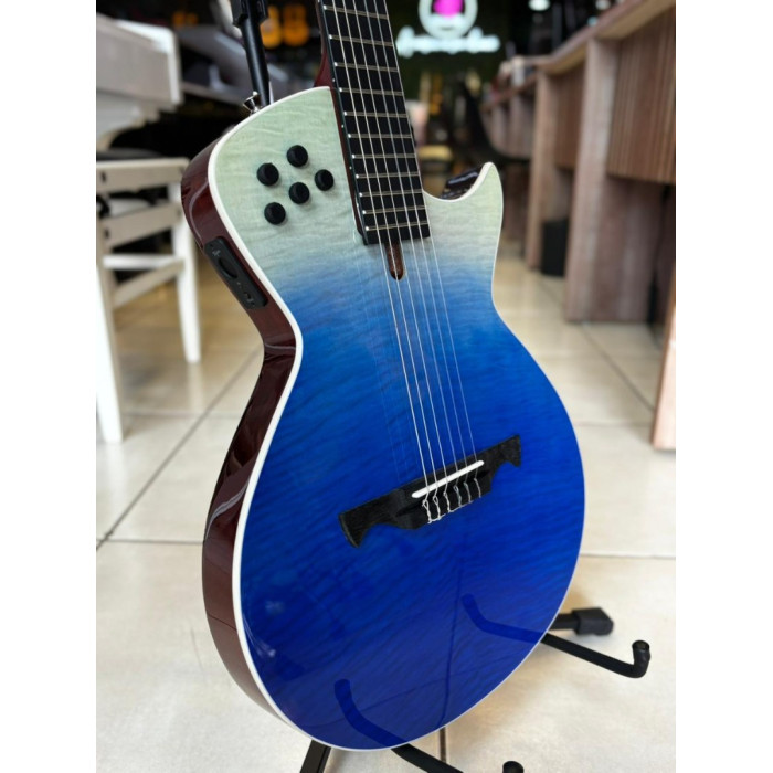 O Violão Tagima Modena Nylon TBLF (Transparent Blue Fade) é um violão eletroacústico de corpo sólido, com design flat (fino), ideal para palco, com tampo em Maple Flameado (ou Spruce, dependendo da versão), corpo em Sapele com tone chambers (câmaras internas para leveza e ressonância), braço em Maple, escala em Rosewood, cordas de nylon, nut de osso e captação Piezo com pré-amplificador Tagima TEQ10 para som amplificado, oferecendo conforto, sonoridade rica e visual moderno.