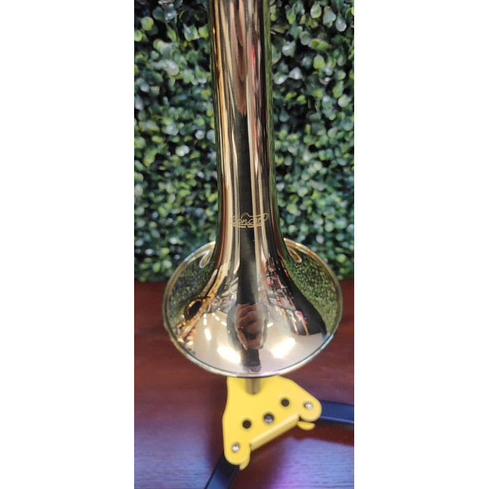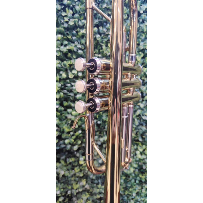 Acabamento LAQ/NIQ: O corpo possui verniz laqueado (dourado), enquanto as pompas, chaves e bocal costumam ter acabamento niquelado (prateado), o que aumenta a durabilidade do revestimento.